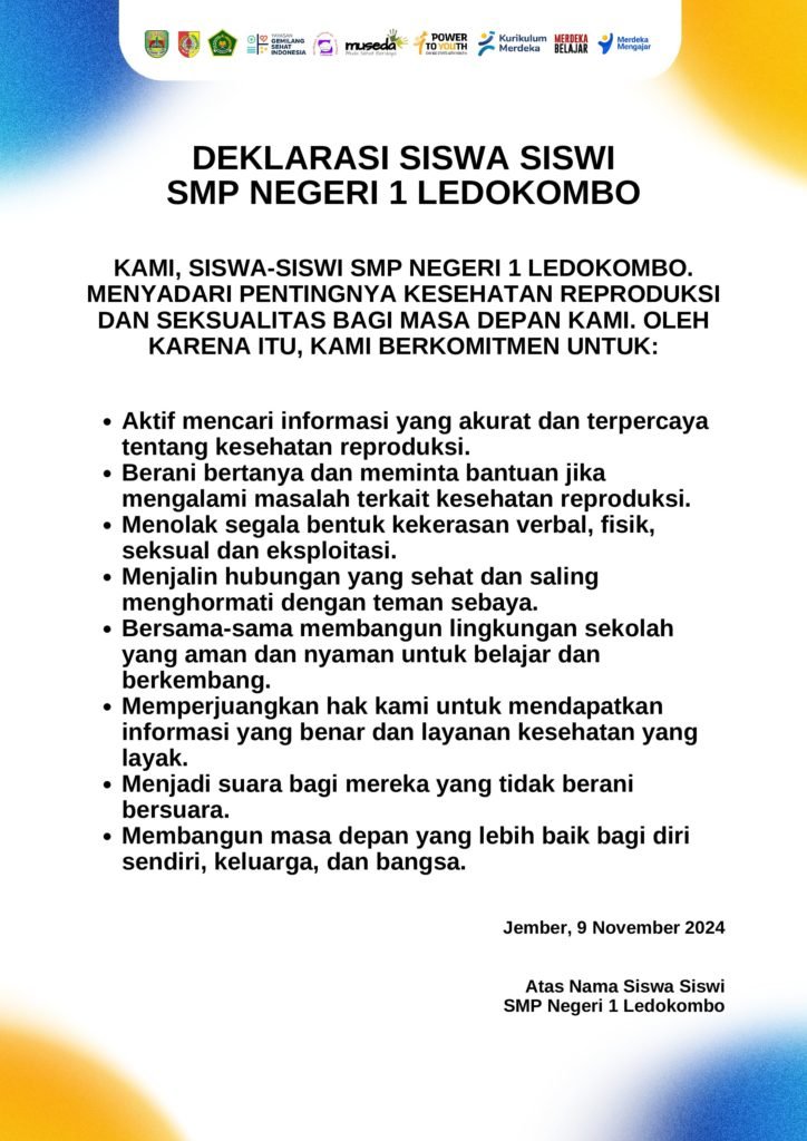 Pernyataan ini menegaskan komitmen siswa SMP Negeri 1 Ledokombo untuk menjaga kesehatan reproduksi, menolak kekerasan, membangun lingkungan sekolah yang aman, serta memperjuangkan hak atas informasi dan layanan kesehatan yang layak.