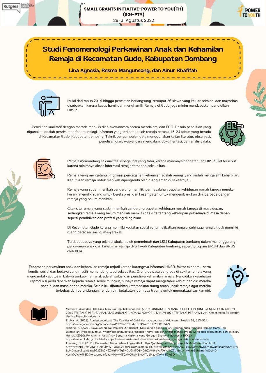 This research was conducted based on the situation in Gudo District, Jombang Regency, East Java. From 2019 until the research took place, there was 26 students who dropped out of school, the majority of which were caused by cases of pregnancy and impregnation. Based on the findings, the contributing factor was that Gudo’s youth received minimal SRHR education. In addition, adolescents who know pregnancy prevention information are adolescents who have experienced pregnancy. Space that supports social activities for adolescents is also lacking, so youth do not have space to socialize in society. There have been efforts made by the government and CSOs of Jombang Regency in tackling child marriage and teenage pregnancy in Jombang Regency, such as the BRUN and BRUS programs by the KUA.