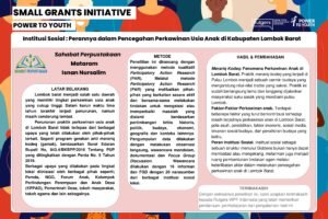 The research conducted by Friends of the Library of Mataram was designed to look at the role of various social institutions such as the local government, NGOs, Children’s Forums, Village Women and Children Protection Groups (KPPAD), Village Government, Community Leaders, Religious Leaders, and so on. The research method uses a qualitative approach, namely Participatory Action Research (PAR) by interviewing 16 informants and FGDs with 20 informants from various local social agencies. One of the topics of discussion is the cultural context, namely Merariq Kodeq which has been going on for a long time and has been carried out by the Sasak people in Lombok. The next result is that there are various factors that cause child marriage in West Lombok, namely parenting, education, economic factors, social media, socio-cultural pressures, and wrong cultural interpretations. The conclusion of this study,