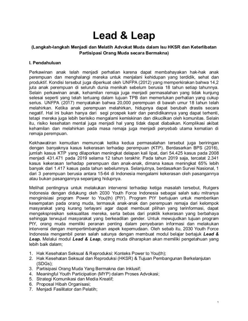 Modul Lead & Leap merupakan panduan pembelajaran dan pelatihan bagi orang muda untuk menjadi advokat dalam isu Hak Kesehatan Seksual dan Reproduksi (HKSR) dan mendorong partisipasi yang bermakna dalam pengambilan keputusan. Disusun oleh 2030 Youth Force Indonesia dalam program Power to You(th), modul ini membekali peserta dengan pemahaman tentang HKSR, strategi advokasi, penggunaan media kreatif, pembuatan proposal, hingga keterampilan menjadi fasilitator. Modul ini dirancang untuk memperkuat kapasitas orang muda dalam menciptakan perubahan sosial yang inklusif dan berbasis hak.