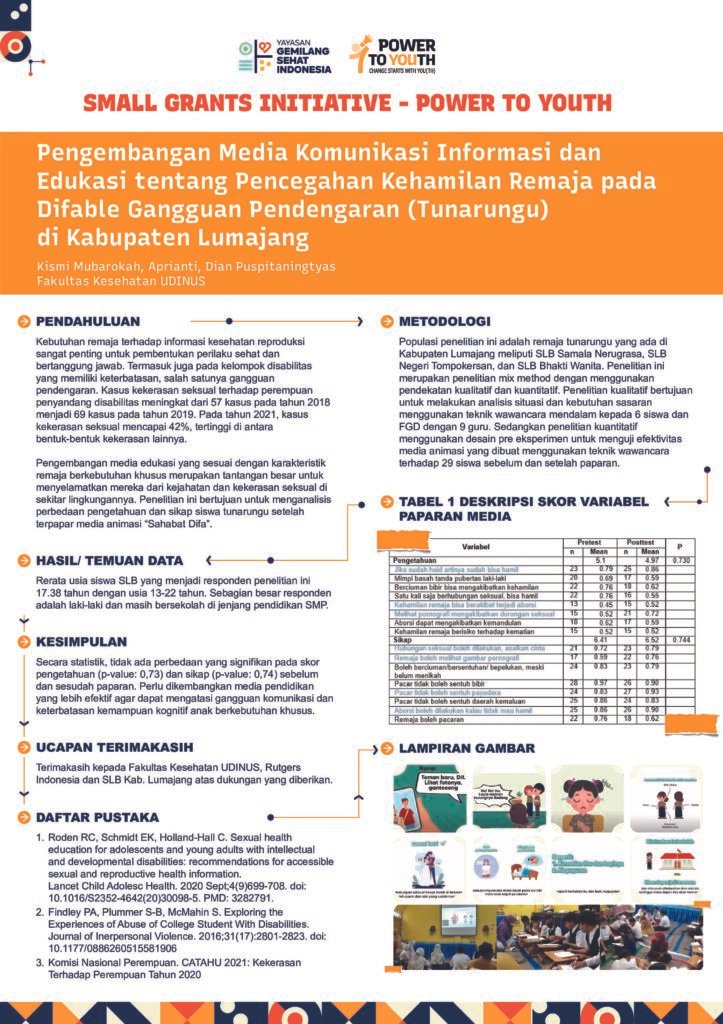 Poster hasil riset dan aktivitas inisiatif penerima hibah SGI terkait dengan pengembangan media komunikasi edukatif untuk mencegah kehamilan remaja pada difabel tunarungu di Kabupaten Lumajang. Penelitian ini menunjukkan pentingnya media visual berbasis animasi sebagai sarana efektif untuk meningkatkan pemahaman remaja tunarungu tentang kesehatan reproduksi secara inklusif dan mudah diakses.