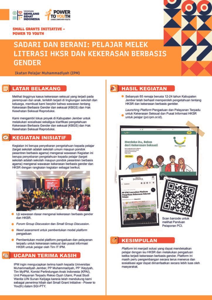 Poster hasil inisiatif penerima hibah SGI dari IPM yang mengembangkan platform pengaduan dan pusat informasi HKSR bagi pelajar di Kabupaten Jember. Kegiatan ini bertujuan meningkatkan literasi remaja tentang kekerasan berbasis gender dan kesehatan reproduksi melalui sosialisasi serta pendekatan digital yang inklusif.