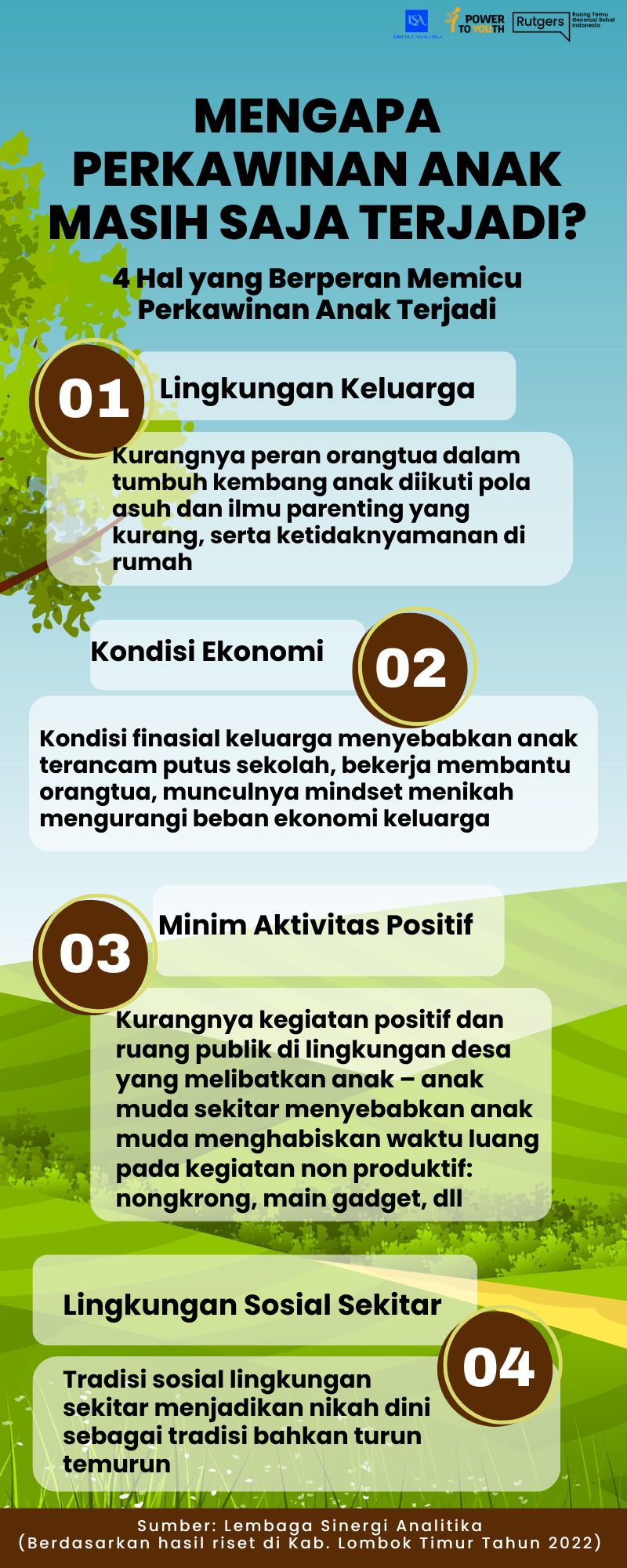 Infografis ini mengungkap empat penyebab utama pernikahan anak, yaitu masalah keluarga, ekonomi, kurangnya aktivitas positif, dan pengaruh tradisi sosial, berdasarkan riset di Lombok Timur tahun 2022.