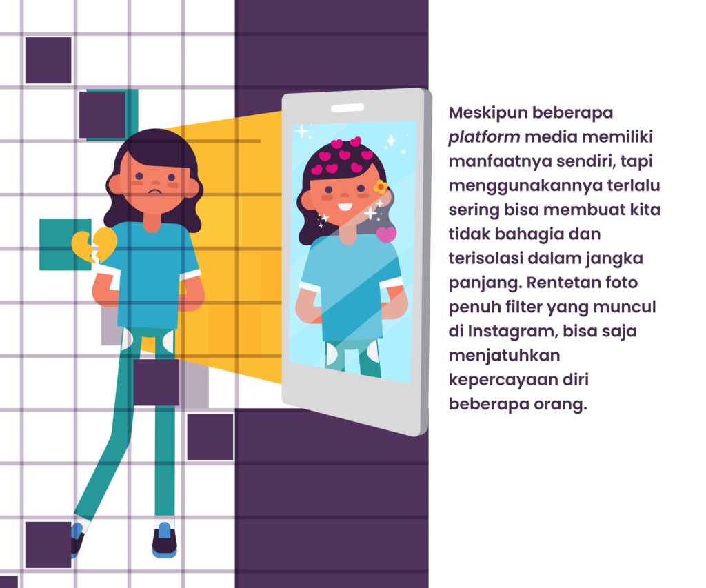 Meskipun beberapa platform media memiliki manfaatnya sendiri, tapi menggunakannya terlalu sering bisa membuat kita tidak bahagia dan terisolasi dalam jangka panjang. Rentetan foto penuh filter yang muncul di Instagram, bisa saja menjatuhkan kepercayaan diri beberapa orang. Sementara itu, mengecek linimasa Twitter secara obsesif sebelum tidur, bisa berpengaruh pada kualitas tidur yang buruk.