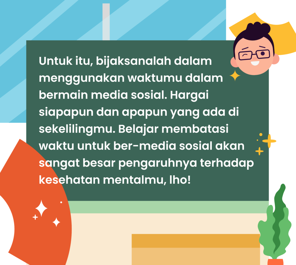 Untuk itu, bijaksanalah dalam menggunakan waktumu dalam bermain media sosial. Hargai siapapun dan apapun yang ada di sekelilingmu. Belajar membatasi waktu untuk ber-media sosial akan sangat besar pengaruhnya terhadap kesehatan mentalmu, lho!